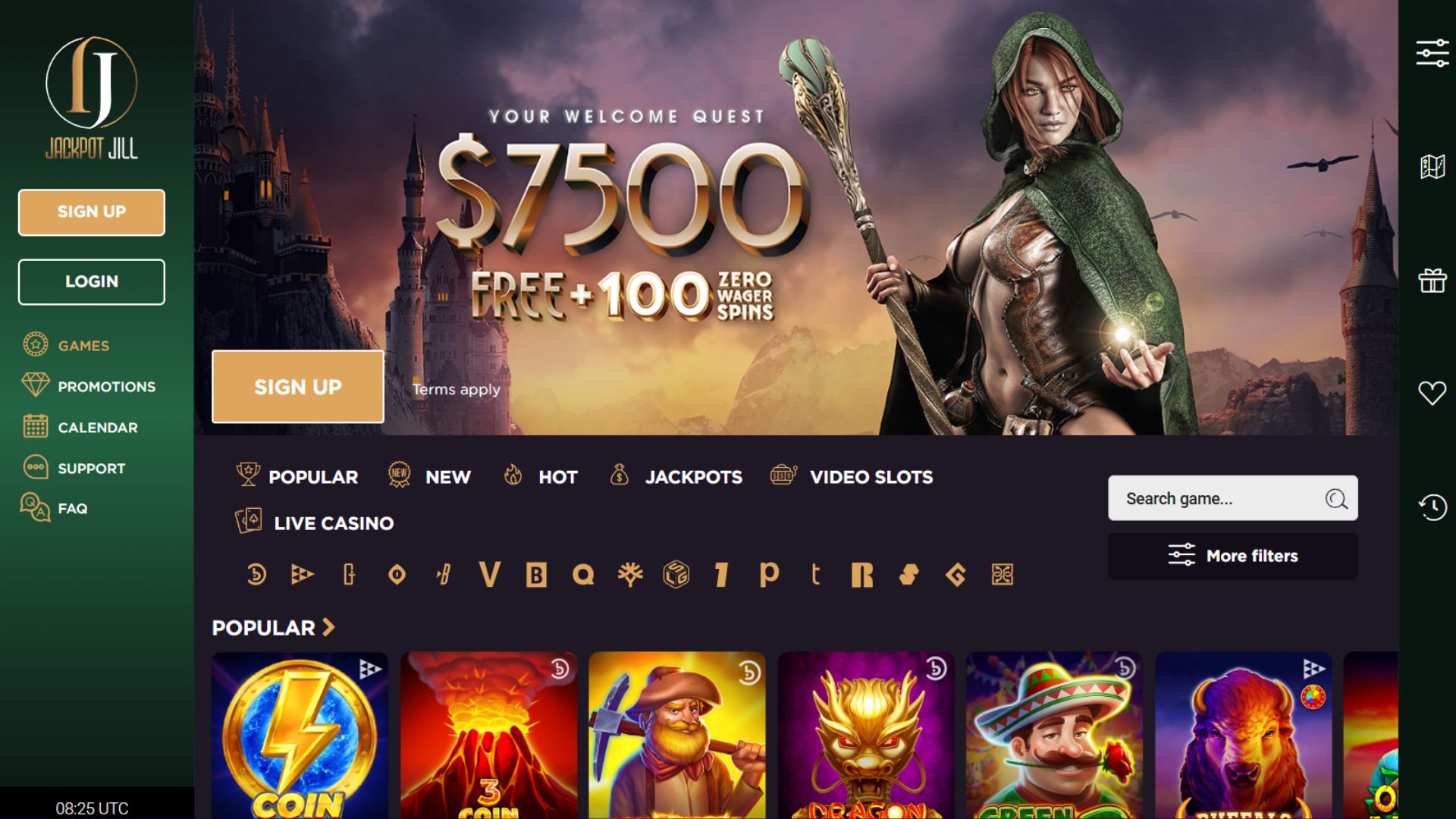 There are over 2,000 online casino games, so you’ll never be bored – we certainly weren’t during our Jackpot Jill review! There is a search function which makes it easy to find and play exactly what you want in seconds, and you can even filter the games by software provider, type of game and popular features like Megaways, Bonus Buy and Hold and Win.
